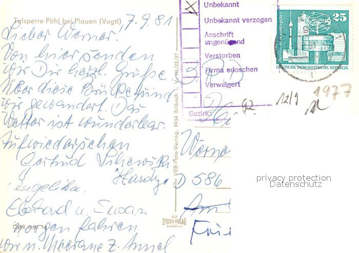 72971265 alte Postkarte Plauen Vogtland Talsperre Poehl postalisch gelaufen Erhaltung siehe scans [NatalD47] KatCode: 11110014166000
