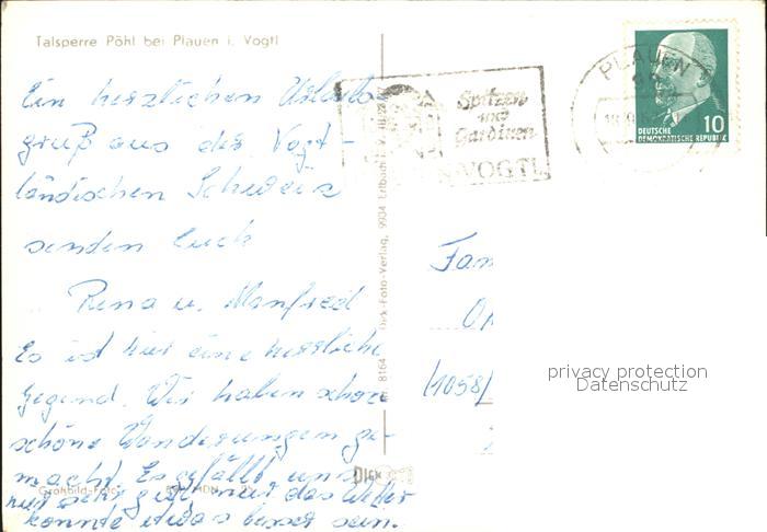 72024218 alte Postkarte Plauen Vogtland Talsperre Poehl postalisch gelaufen Erhaltung siehe scans KatCode: 11110014166000
