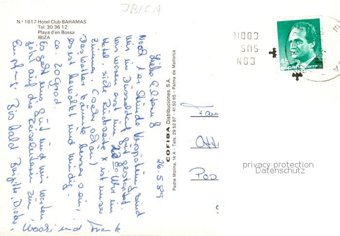 old postcard Playa d en Bossa Ibiza ES Hotel Club Bahamas postalisch gelaufen Erhaltung siehe scans [WerneD78]
