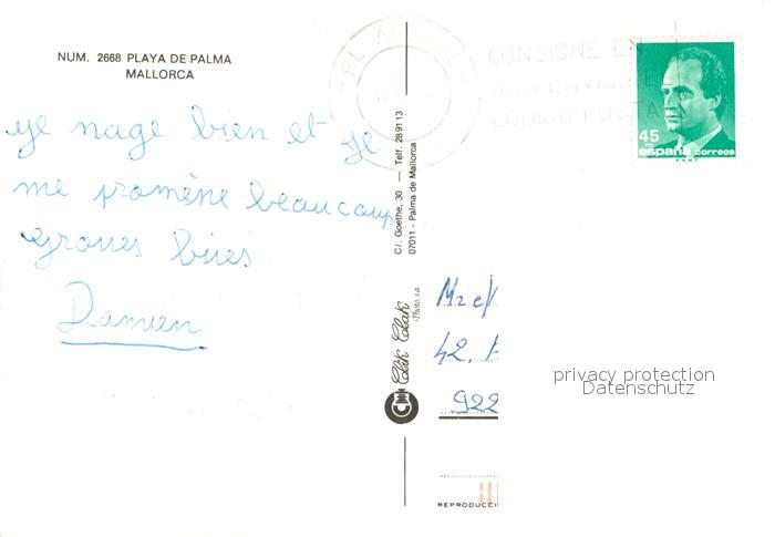 old postcard Playa de Palma Mallorca Brunnen Platz Hotels Gebaeude postalisch gelaufen Erhaltung siehe scans [FriedD77]