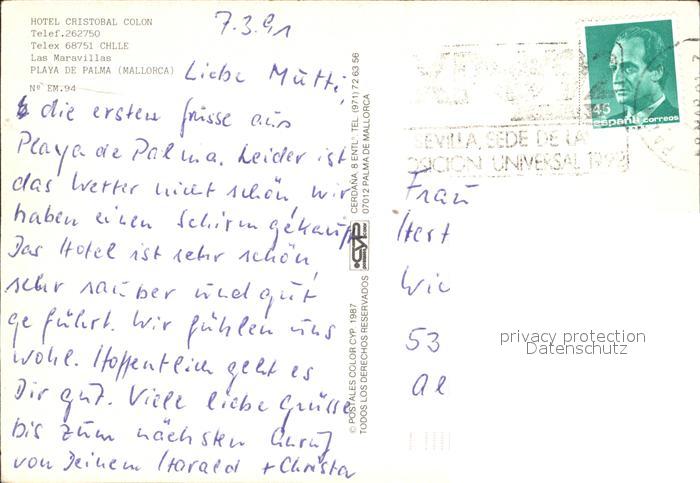 old postcard Playa de Palma Mallorca Hotel Cristobal Colon postalisch gelaufen Erhaltung siehe scans [LiesaD40]