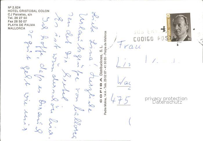 old postcard Playa de Palma Mallorca Hotel Cristobal Colon postalisch gelaufen Erhaltung siehe scans