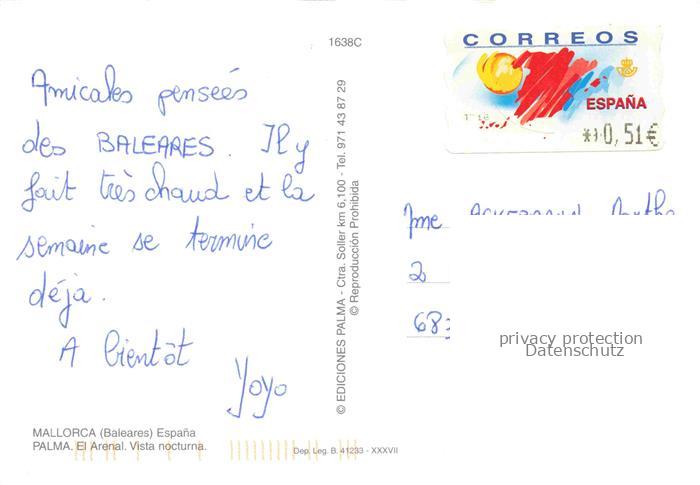 74015151 old postcard Playa de Palma Mallorca Kuestenpanorama Strand Nachtaufnahme postalisch gelaufen Erhaltung siehe scans [FriedD77] KatCode: 11510