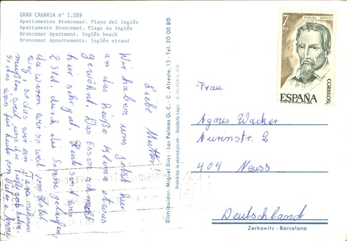 old postcard Playa del Ingles Apartamentos Broncemar Swimming Pool postalisch gelaufen Erhaltung siehe scans