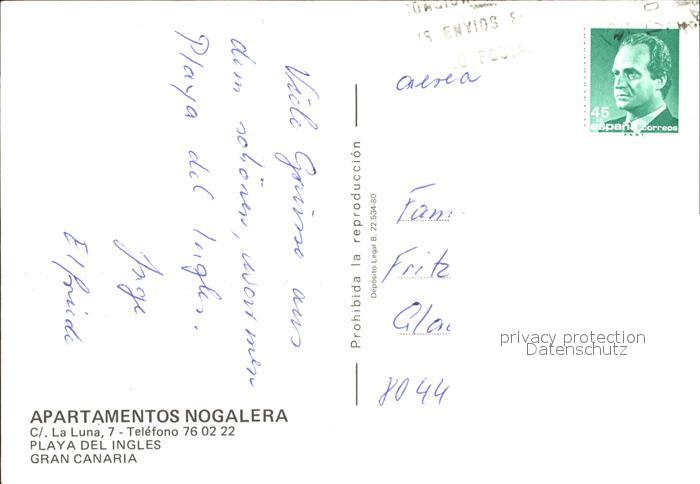 old postcard Playa del Ingles Apartamentos Nogalera postalisch gelaufen Erhaltung siehe scans
