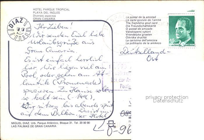 old postcard Playa del Ingles Hotel Parque Tropical Canarias postalisch gelaufen