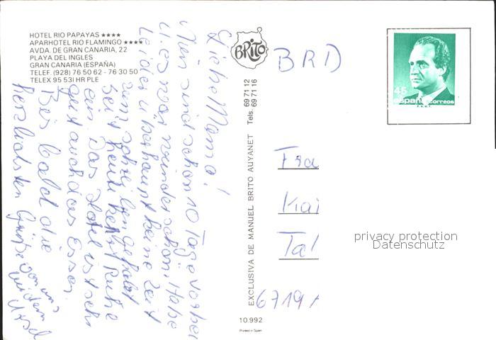 old postcard Playa del Ingles Hotel-Rio-Papayas Hotel-Rio-Flamingo postalisch gelaufen Erhaltung siehe scans