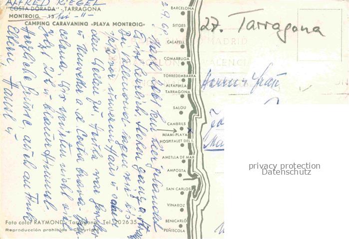 74156487 old postcard Playa Montroig Tarragona ES Camping Caravaning Strand Palmen Zelte Wohnwagen Strassenszene Meer postalisch gelaufen Erhaltung siehe scans [Karloger] KatCode: 11510