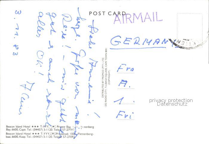 alte Postkarte Plettenberg Bay Beacon Island Hotel postalisch gelaufen Erhaltung siehe scans