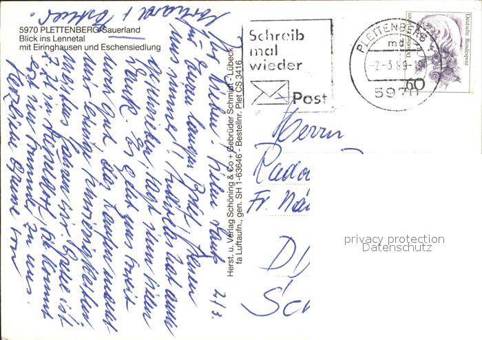 72253757 alte Postkarte Plettenberg Blick ins Lennetal Eiringhausen Eschensiedlung Fliegeraufnahme postalisch gelaufen Erhaltung siehe scans KatCode: 11110005962052