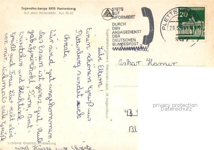 73012213 alte Postkarte Plettenberg Jugendherberge postalisch gelaufen Erhaltung siehe scans [KathaD81] KatCode: 11110005962052