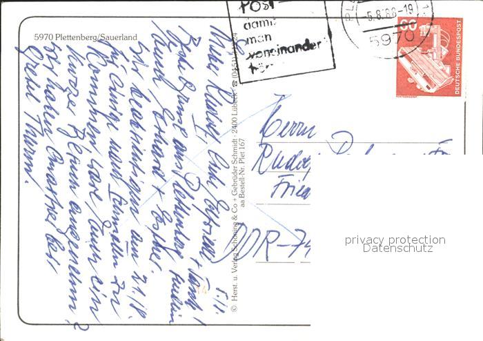 72253756 alte Postkarte Plettenberg Marktplatz Strassencafe Partie am Fluss postalisch gelaufen Erhaltung siehe scans KatCode: 11110005962052