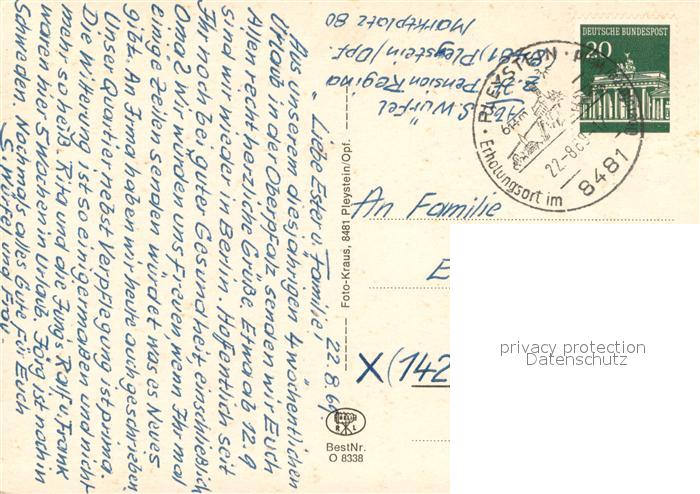 73735833 alte Postkarte Pleystein Schullandheim Kreuzberg Kirche Marktplatz Zollbachhaus Zollbachtal Panorama postalisch gelaufen Erhaltung siehe scans [FriedD77] KatCode: 11110009374147