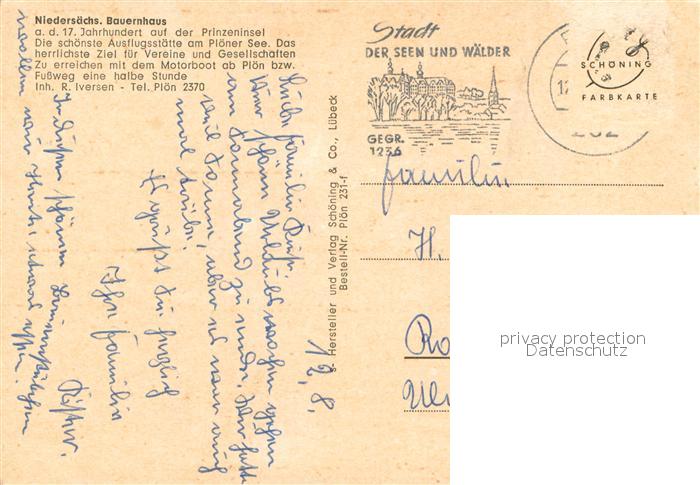 73708638 alte Postkarte Ploen See Niedersaechsisches Bauernhaus Ausflugsgaststaette Gartenterrasse Seenlandschaft Holsteinische Schweiz postalisch gelaufen Erhaltung siehe scans [FriedD77] KatCode: 11110001057057