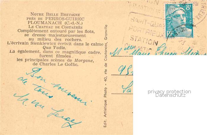 12840802 carte postale Ploumanach Chateau de Costaeres postalisch gelaufen Erhaltung siehe scans [FriedD77] KatCode: 11170022322168