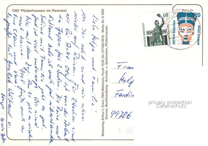 72958846 alte Postkarte Pluederhausen Kirche Staufenhalle Badesee Ochsenbraterei Festtage postalisch gelaufen Erhaltung siehe scans [FriedD77] KatCode: 11110008119055