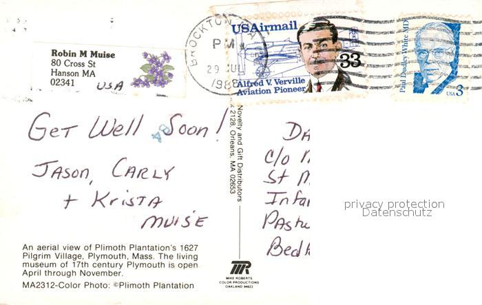 73131702 old postcard Plymouth Massachusetts Pilgrim Village Fliegeraufnahme postalisch gelaufen Erhaltung siehe scans [KathaD81] KatCode: 14140230000000