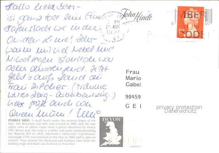 old postcard Plymouth UK South West Plymouth Hoe Leuchtturm postalisch gelaufen Erhaltung siehe scans