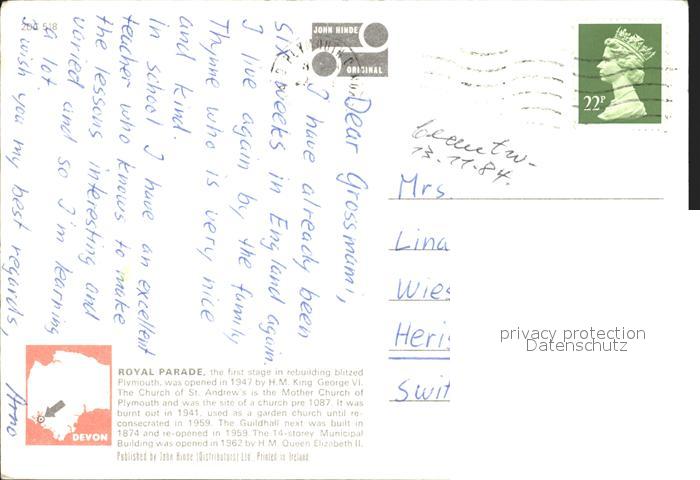 old postcard Plymouth UK South West Royal Parade and Civic Centre postalisch gelaufen Erhaltung siehe scans