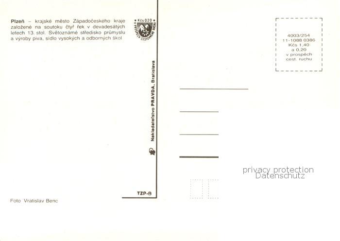 Plzen Pilsen Krajske mesto Zapadoceskeho kraje zalozene na soutoku ctyf fek v evadesatych letech Svetozname stredisko prumyslu a vyroby piva postalisch nicht gelaufen Erhaltung siehe scans [FriedD77]