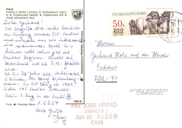 old postcard Plzen Pilsen Pohled k sidlisti Lochatin Gottwaldovo nadrati Charkovske nabrezi Vodarenska vez Areal uchovskych skol postalisch gelaufen Erhaltung siehe scans [WerneD78]