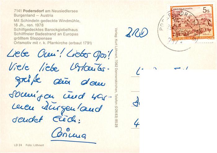 73925473 alte Postkarte Podersdorf Neusiedler See AT Windmuehle Barockgiebelhaus Badestrand Ortsmotiv mit Kirche postalisch gelaufen Erhaltung siehe scans [FriedD77] KatCode: 11390112010718