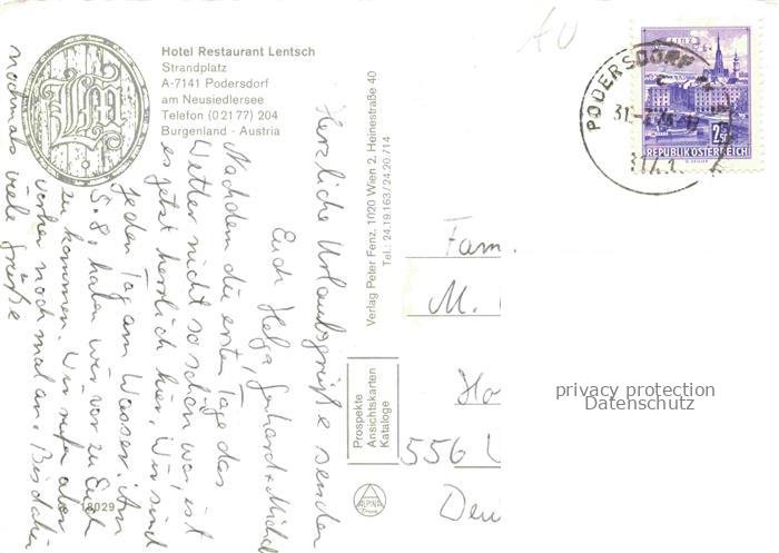 74122027 alte Postkarte Podersdorf Neusiedler See Burgenland AT Hotel Lentsch Restaurant Zimmer Terrasse postalisch gelaufen Erhaltung siehe scans [WerneD78] KatCode: 11390112010718