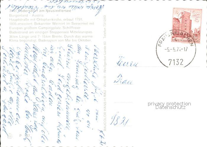 72375465 alte Postkarte Podersdorf See Burgenland Hauptstrasse Pfarrkirche postalisch gelaufen Erhaltung siehe scans KatCode: 11390112010718