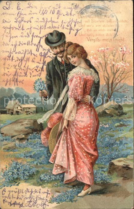 alte Postkarte Poesie Gedicht Paar Vergissmeinnicht Hutmode Litho postalisch gelaufen Erhaltung siehe scans