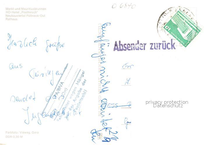 72958216 alte Postkarte Poessneck Markt Mauritiusbrunnen HO Hotel Posthirsch Neubauviertel Rathaus postalisch gelaufen Erhaltung siehe scans [FriedD77] KatCode: 11110016075085