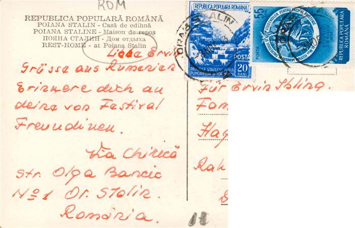 73970831 old postcard Poiana Stalin RO Rest-Home postalisch gelaufen Erhaltung siehe scans [FriedD77] KatCode: 11430