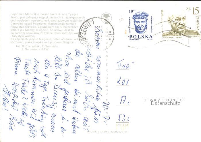 old postcard Pojezierze Mazurskie Seebruecke Ente Strand Badefreuden postalisch gelaufen Erhaltung siehe scans