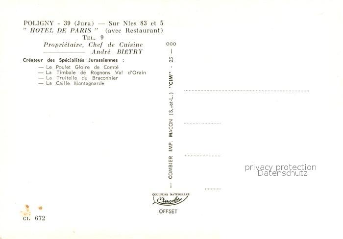 13742897 Poligny Jura Hôtel de Paris Restaurant postalisch nicht gelaufen Erhaltung siehe scans [FriedD77] Frie Katcode 11170039239434