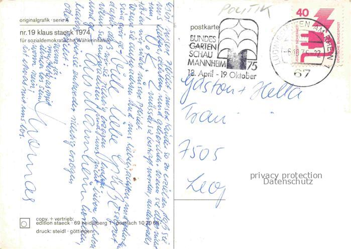 74055082 alte Postkarte Politik CDU Wahl Nr. 19 Klaus Staeck postalisch gelaufen Erhaltung siehe scans [SanaeD93] KatCode: 22420000000300