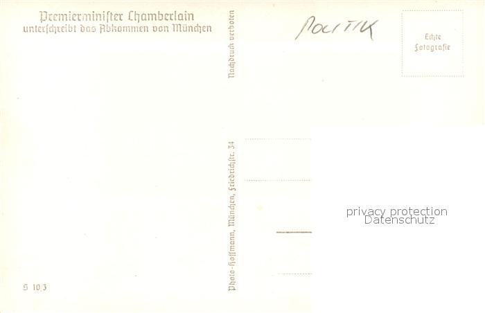 13551808 Politik Premierminister Chamberlain Abkommen von M?nchen postalisch nicht gelaufen Erhaltung siehe scans [PaolaD17] Paol Katcode 22420000000300
