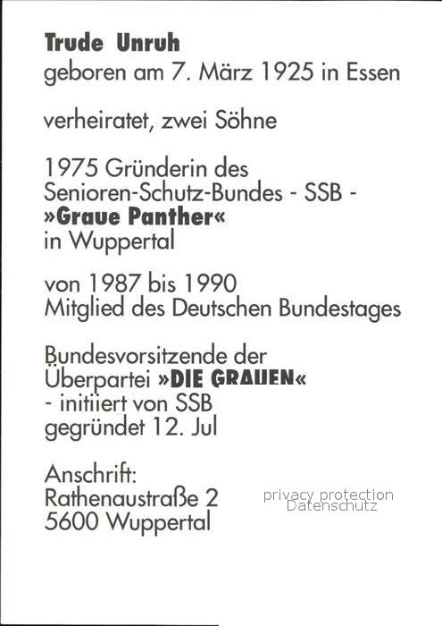 Politiker Trude Unruh Gruenderin Graue Panther postalisch nicht gelaufen Keine Postkarte (siehe scan) Erhaltung siehe scans [PaolaD17]