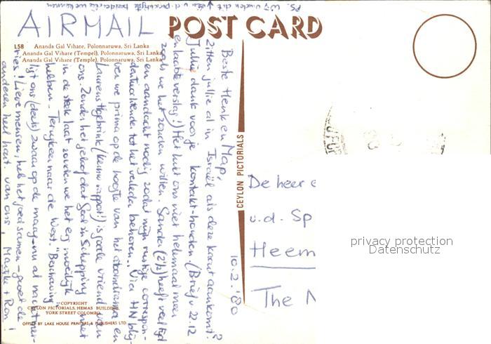 old postcard Polonnaruwa Ananda Gal Vihare Tempel postalisch gelaufen Erhaltung siehe scans