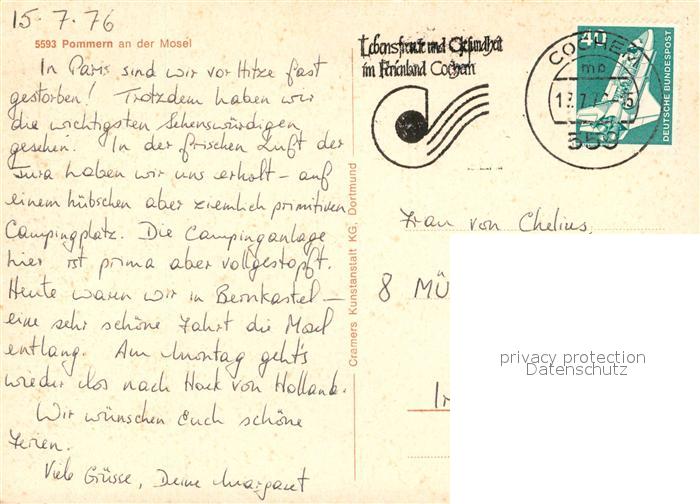 73312165 alte Postkarte Pommern Mosel postalisch gelaufen Erhaltung siehe scans [NatalD47] KatCode: 11110007135072