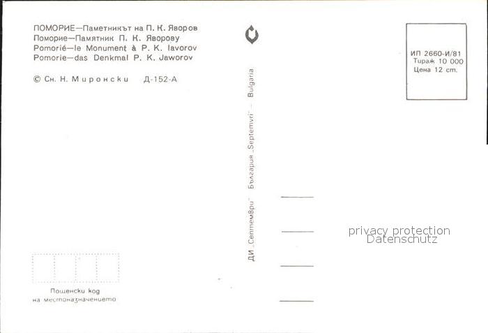 Pomorie Denkmal P.K. Jaworov postalisch nicht gelaufen Erhaltung siehe scans [LiesaD40]