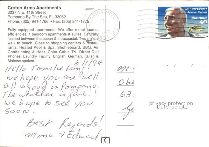 71847839 old postcard Pompano Beach Croton Arms Apartments postalisch gelaufen Erhaltung siehe scans KatCode: 14140110000000