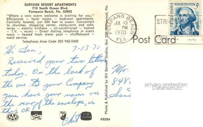73257876 old postcard Pompano Beach Surfside Resort Apartments postalisch gelaufen Erhaltung siehe scans [NatalD47] KatCode: 14140110000000