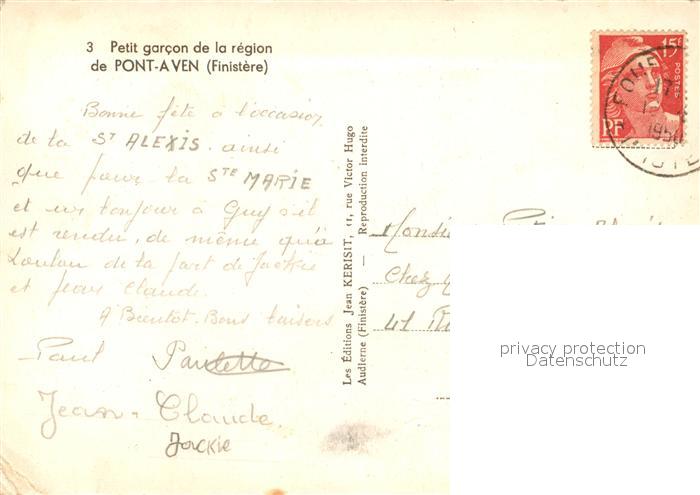 13580815 carte postale Pont-Aven Costume d un petit garcon de la région Trachten postalisch gelaufen Erhaltung siehe scans [FriedD77] KatCode: 11170029429217