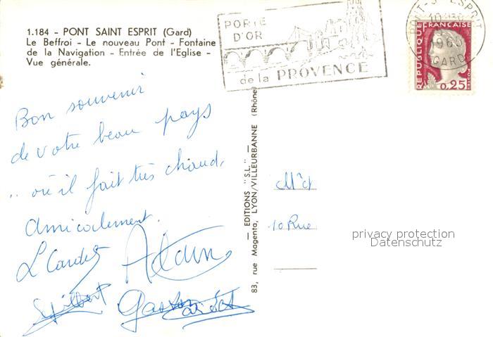 13593136 Pont-Saint-Esprit Le Beffroi Pont Fontaine de la Navigation Entrée de l’Eglise vue Generale postalisch gelaufen Erhaltung siehe scans [FriedD77] carte postale Frie Katcode 11170030230202
