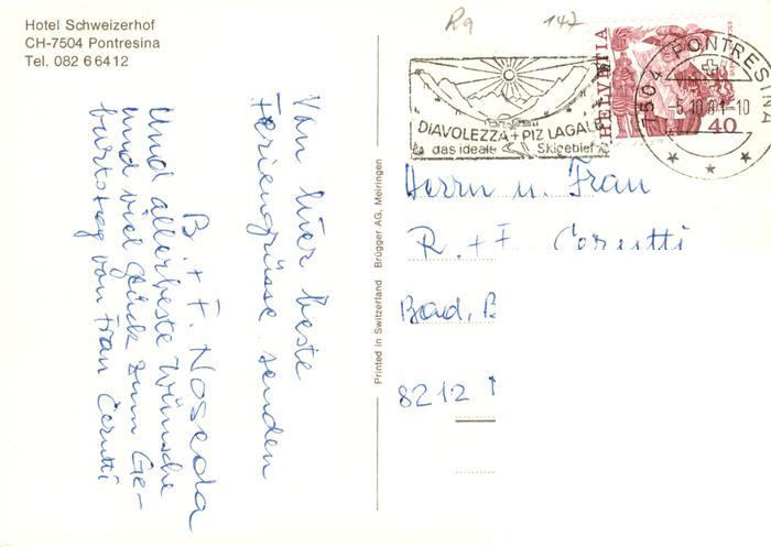 13883739 alte Postkarte Pontresina Hotel Schweizerhof postalisch gelaufen Erhaltung siehe scans [FriedD77] KatCode: 11470100335220