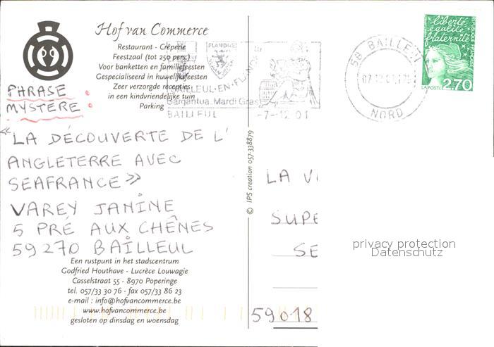 71860555 carte postale Poperinge Restaurant-Creperie Hof van Commerce postalisch gelaufen KatCode: 11070033001507
