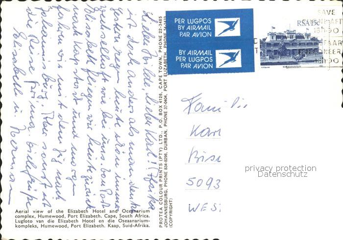alte Postkarte Port Elizabeth Southafrica Fliegeraufnahme Elizabeth Hotel postalisch gelaufen Erhaltung siehe scans