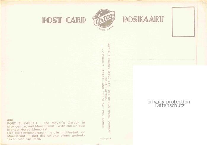 74046910 Port Elizabeth Southafrica The Mayors Garden in city centre and Main Street with the unique bronze Horse Memorial postalisch nicht gelaufen Erhaltung siehe scans [WerneD78] KatCode: 18460