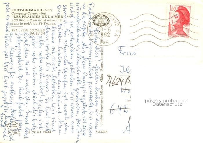 13741969 Port Grimaud Camping Caravaning Les Prairies de la Mer postalisch gelaufen Erhaltung siehe scans [FriedD77] carte postale Frie Katcode 11170083183068