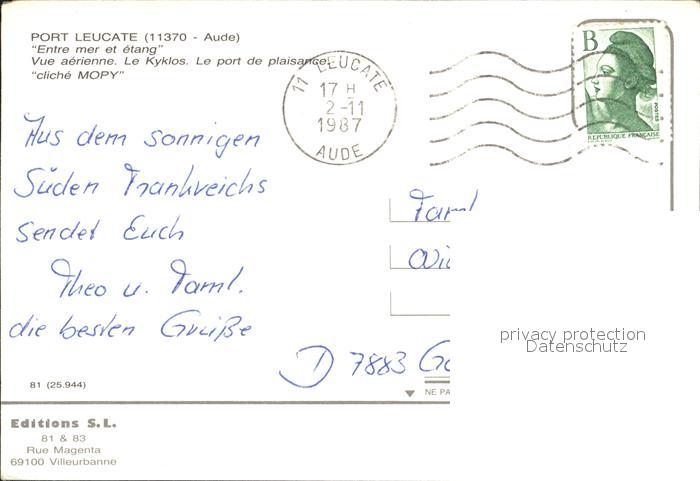 12439120 carte postale Port Leucate Vue aerienne Le Kyklos Le port de plaisance cliche Mopy postalisch gelaufen Erhaltung siehe scans KatCode: 11170011311202
