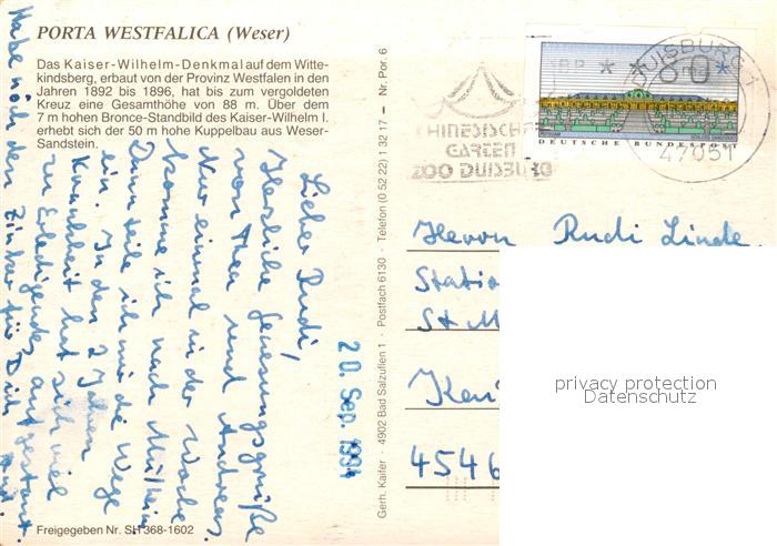 73576183 alte Postkarte Porta Westfalica Kaiser Wilhelm Denkmal auf dem Wittekindsberg Blick ins Tal postalisch gelaufen Erhaltung siehe scans [FriedD77] KatCode: 11110005770032